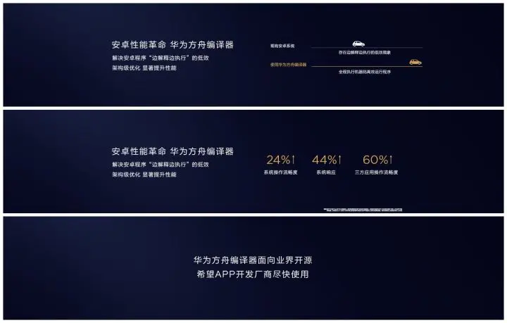 华为则提出了一种新的编译方式:在开发环境就直接一次性将机器码编译出来,打包在安装包中;应用安装完毕就可以直接运行机器码,不需要手机端再次负责编译工作,实现运行效率的最大化提升。这一编译方式的落地化成果,就是随 EMUI 9.1 一道发布的「华为方舟编译器」。