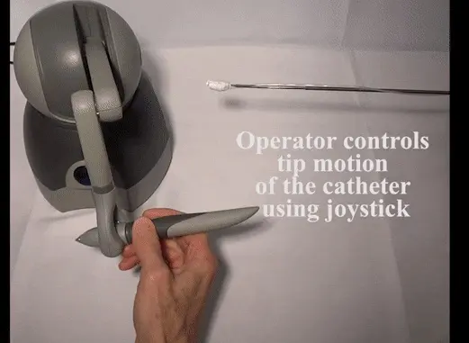 在间歇接触模式下,机器人也会控制接触力不至于过大,机器人导管尖端在与心脏组织接触后会同步移动,防止心脏收缩时被导管刺伤。