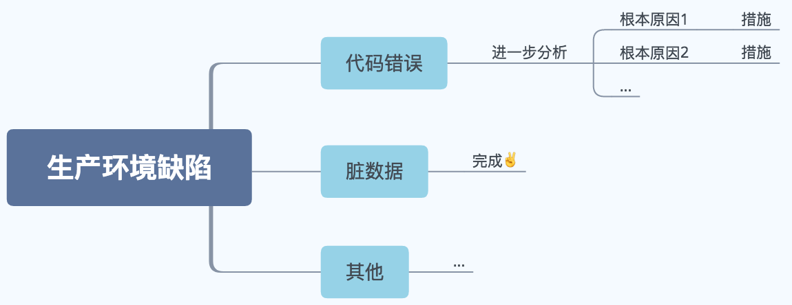 蓝鲸项目的QA会定期分析生产环境的缺陷,当定位某个缺陷为脏数据引起之后,往往就到此为止了。生产环境下的缺陷分析流程是这样的: