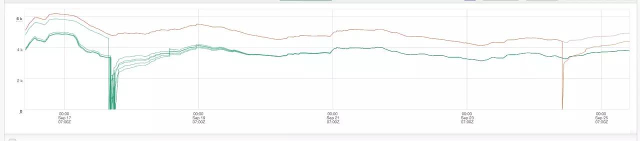 此图是部署到的第一个集群的内存使用情况。顶线(粉红色)隐藏在橙色后面,是集群内存使用的中值。橙色的顶行是一个控件实例。图表的中间部分是新变化的趋势。第三部分显示了一个正在重新启动的控件实例,与淡黄色进行比较。重新启动后,控件的内存使用量迅速增加。
