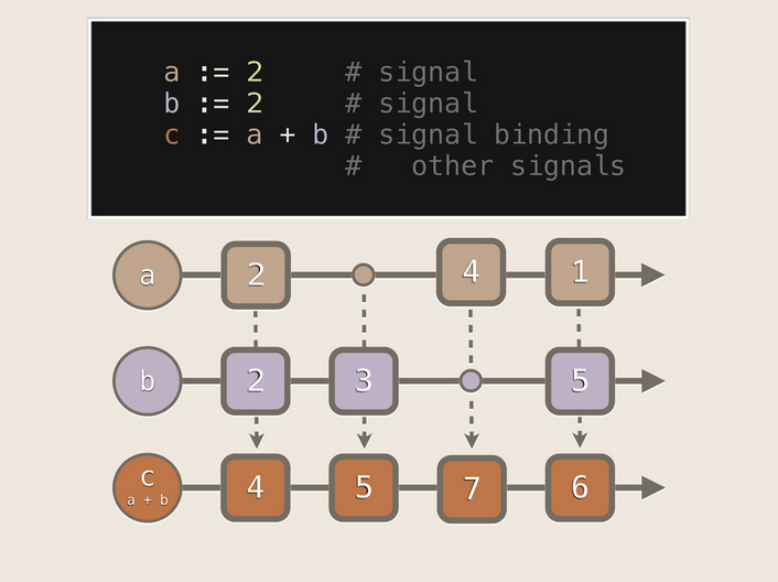 了解到每个架构模式的优缺点之后,这里,我决定用 MVVM 的架构模式来重构我们的 APP。那么说到 MVVM ,我们就肯定是要提到 RAC ,也就是 ReactiveCocoa,它是一个响应式编程的框架,可以使每层交互起来更加方便清晰。当然, RAC 肯定不是实现数据绑定的唯一方案,在 iOS 中比如 KVO、Notification、Delegate、Block等都可以实现,只不过是 RAC 的实现更加优雅一些,所以我们经常会采用 RAC 来实现数据的绑定。关于 RAC ,下面一张图很清晰的解释了它的思想,也就是 FRP(Function Reactive Programming)函数响应式编程