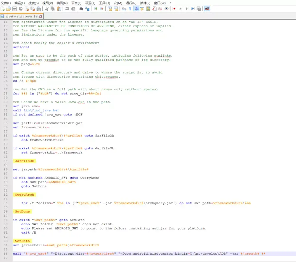 安装ADB并配置环境变量 以便在后续使用中 可以在cmd命令提示符中可以直接调用adb工具(ADB安装目录加入到环境变量的PATH中)将第四步中的UiAutomatorViewer.jar 替换到 Android-SDK安装的lib目录中打开 Android-SDK 目录下的 uiautomatorviewer.bat 进行编辑