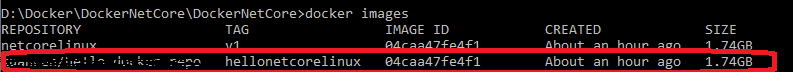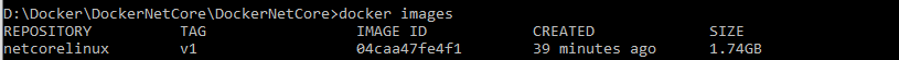 首先我们先执行docker images指令查看本地镜像有哪些,如图所示,本地有一个名为netcorelinux:v1的镜像: