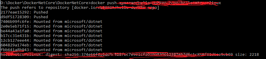 docker push test/hello-repo:hellonetcorelinux 该指令的意思是将标记好的名为hellonetcorelinux镜像上传到test下的hello-repo镜像仓库中,执行结果如图所示: