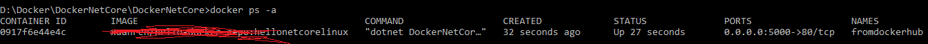 docker run -d -p 5000:80 fromdockerhub test/hello-repo:hellonetcorelinux 该指令表示的意思是基于test下的hello-repo镜像仓库中的hellonetcorelinux镜像创建一个名为fromdockerhub的容器实例并运行,将容器的80端口与主机的5000端口进行映射,执行结果如图所示: