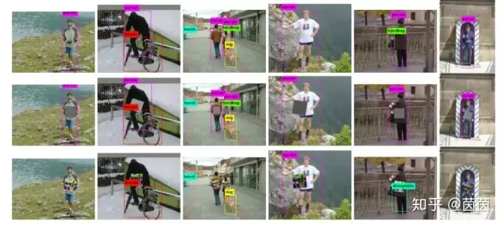 上图所示为在 Inria 测试集中使用不同贴纸的效果对比示例。首先将 YOLOv2 检测器用于没有贴 patch 的图像中(第 1 行),然后是使用随机贴纸(第 2 行)以及生成的最佳贴纸的效果(第 3 行)。在大多数情况下,贴纸能够成功地将人员隐藏在探测器中。如果效果不好,则可能是贴纸没有和人对齐。因为在优化期间,贴纸的中心对齐是仅仅由图像边框确定的。