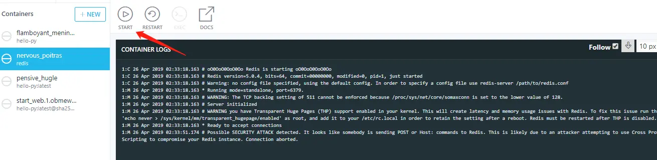 注意: 双引号!!!,docker解析的是一个JSON array