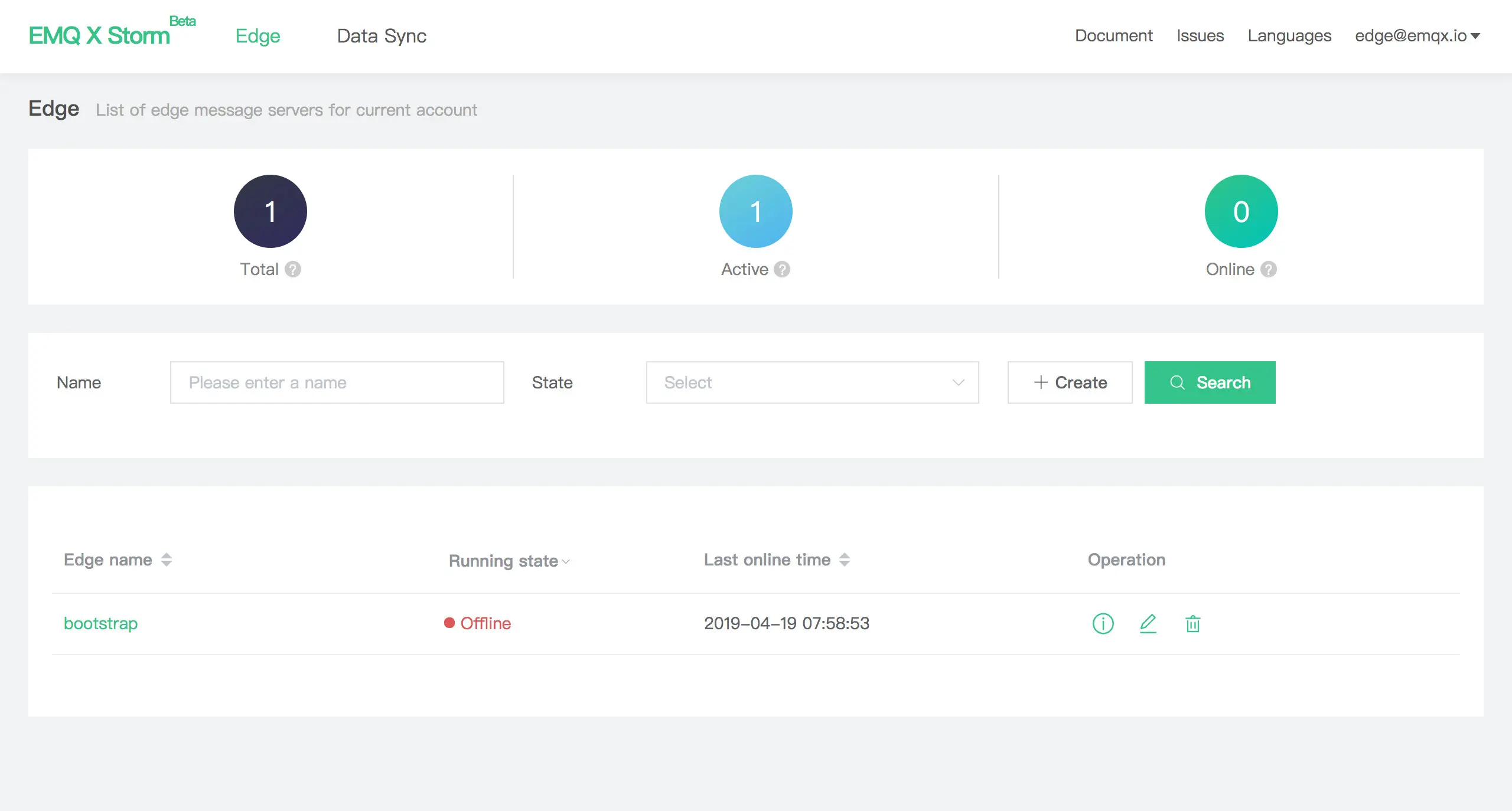 EMQ X Storm 当前处于 beta 测试版本,已经实现的功能如下: Edge 服务器管理:注册绑定式接入管理,部署、接入的服务器,以及状态等信息一目了然; Edge 服务器监控:查看 Edge 边缘消息服务器上的设备接入信息,包括服务器运行状态、连接列表、会话信息与 MQTT 主题信息; 数据同步:云端配置 EMQ X Edge 的数据同步规则,实现消息路由、转发规则可视化管理,打通边缘侧与中心侧数据通信; API 集成能力:Storm 提供了一系列的 REST API,用户可以根据需要来跟自己的系统进行无缝集成。
