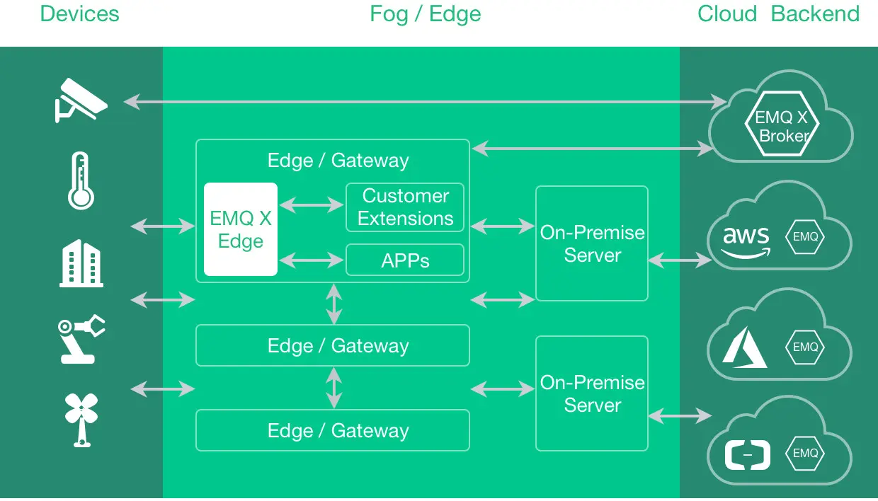 EMQ X Edge 是轻量级开源消息服务器,可运行在资源受限的边缘设备上,它是连接云端和本地设备之间的桥梁。作为物联网平台体系中的边缘计算节点上运行的消息代理,EMQ X Edge 实时响应设备端的请求,并在边缘节点上使用规则引擎对数据本地进行计算处理,将处理结果传至中心侧远程服务器如 EMQ X 集群或其他 MQTT 协议接入服务。