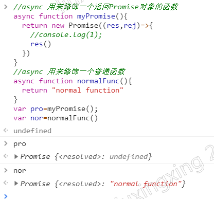 async函数(包含函数语句、函数表达式、Lambda表达式)会返回一个Promise对象,如果在asyn声明的一个函数中直接return 一个直接量,async 会把这个直接量通过Promise.resolve()封装成 Promise 对象。