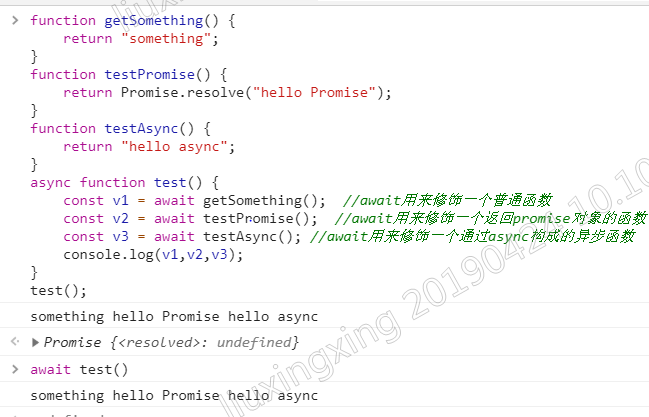 const v2 = await testPromise(); //await用来修饰一个返回promise对象的函数