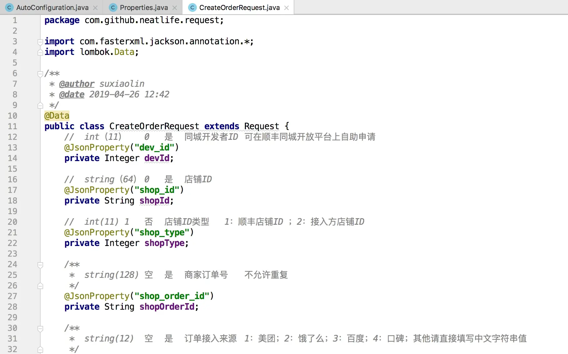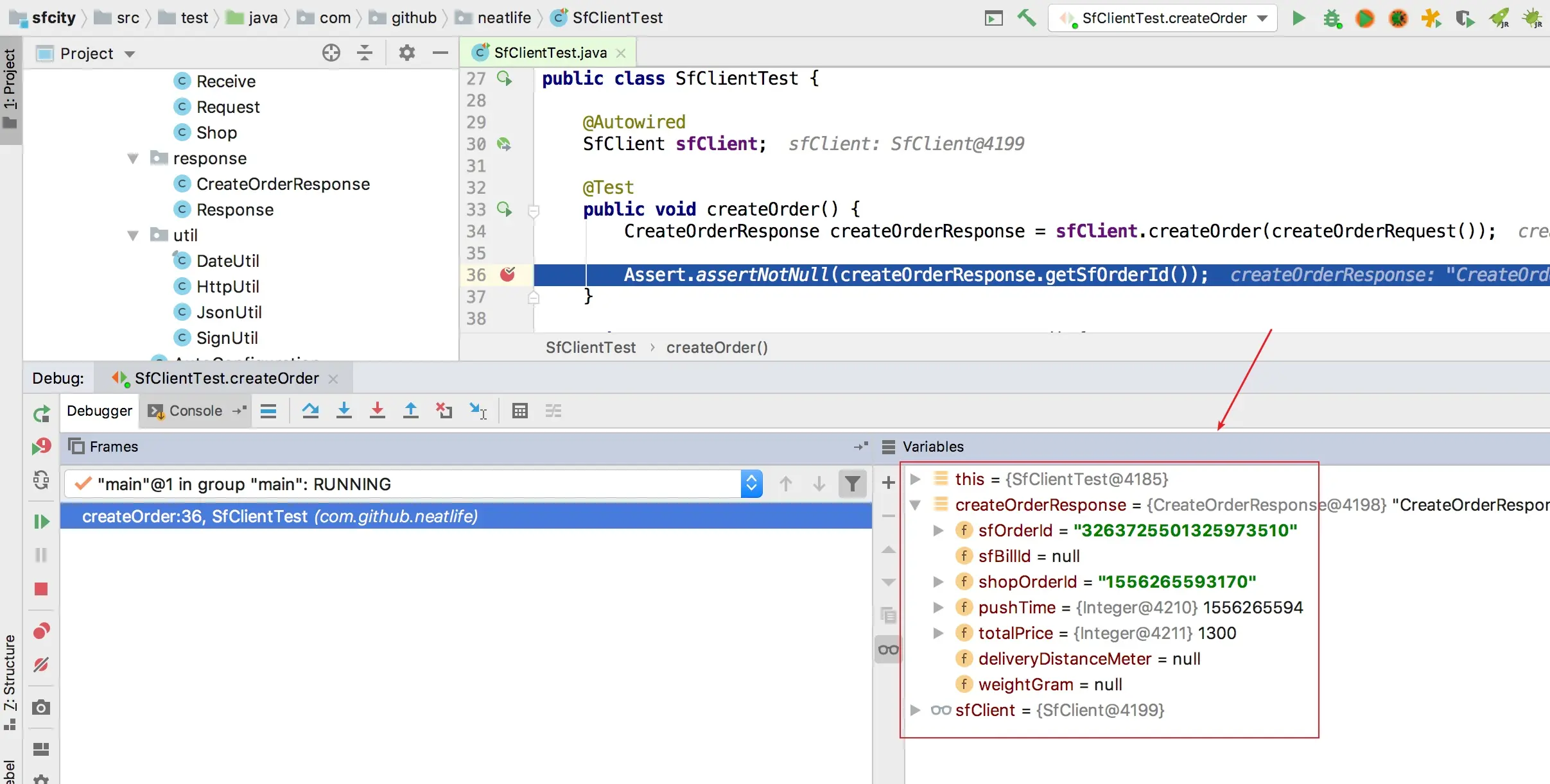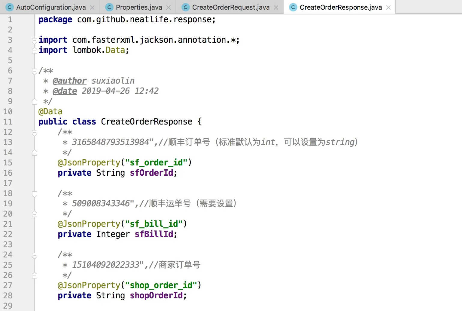 创建测试文件:src/test/java/com/github/neatlife/SfClientTest.java 填充测试数据 调用创建订单方法