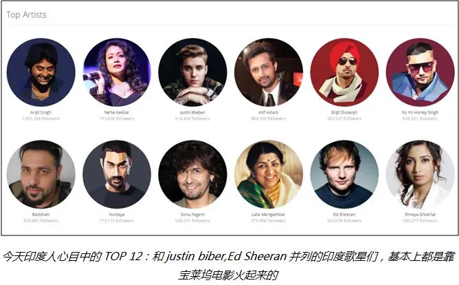 渐渐地,这些宝莱坞歌曲因为曲调轻松、主题接地气,取代传统宗教音乐成为了印度新一代年轻人的首选。白驹过隙,时过境迁,虽然印度流行乐坛新老不断交替,但直到今天,宝莱坞音乐也是印度乐坛当之无愧的绝对主力。根据维基百科数据,目前印度音乐市场流行的作品中有72%来自宝莱坞电影,影视插曲占了印度音乐市场80%的销售额。当然,今天的印度年轻人们对Justin Biber和Ed Sheeran也很感冒。