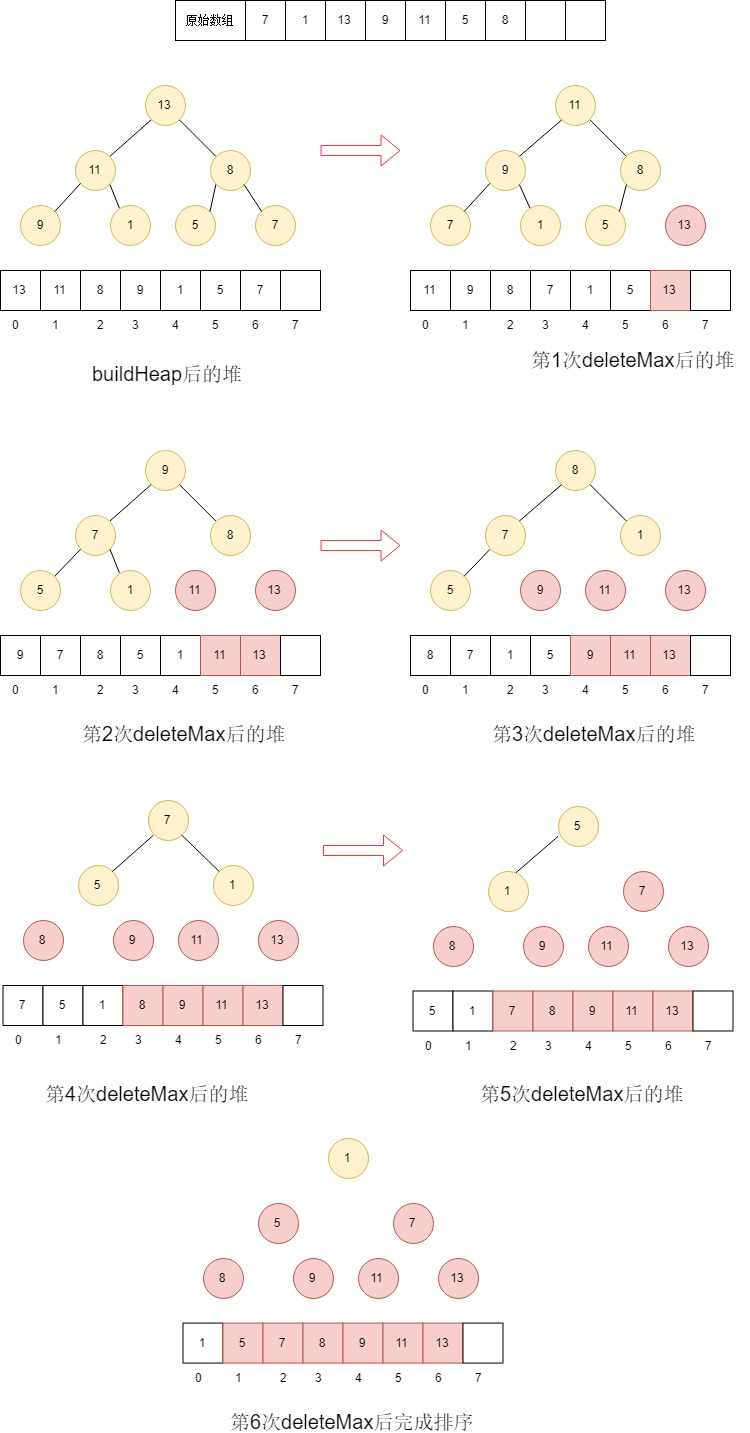 - 算法思想:通过将数组元素进行buildHeap进行堆序化(构建大顶堆);再对堆进行N-1次deleteMax操作。这里有个技巧,如果使用新的数组来存储,需要O(N)的空间;但每次deleteMax会空出一个位置,并将尾端的节点进行下滤操作,那我们就可以将deleteMax的数据放到尾端。