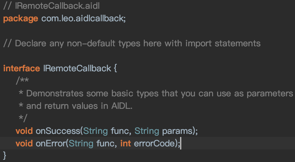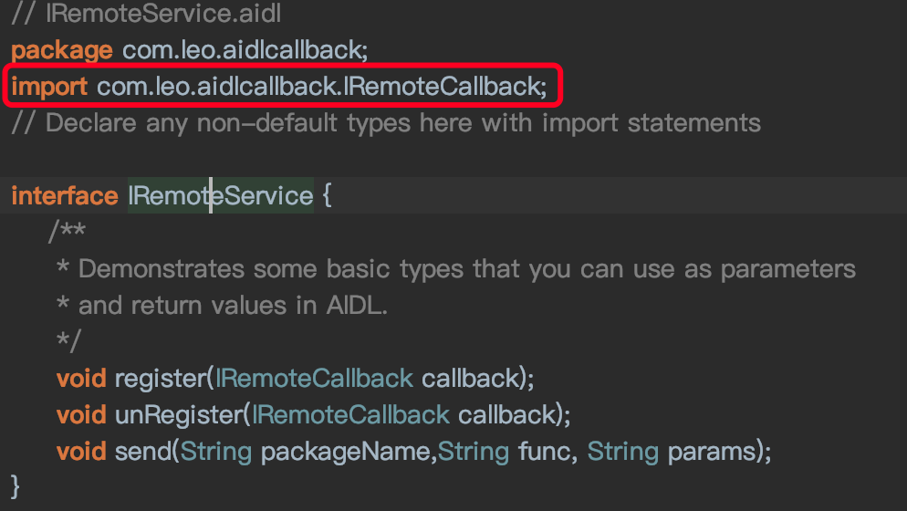 2.在IRemoteService.aidl文件中实现接口的注册和反注册方法(记得要import哦,即使在相同目录结构下也是要的):