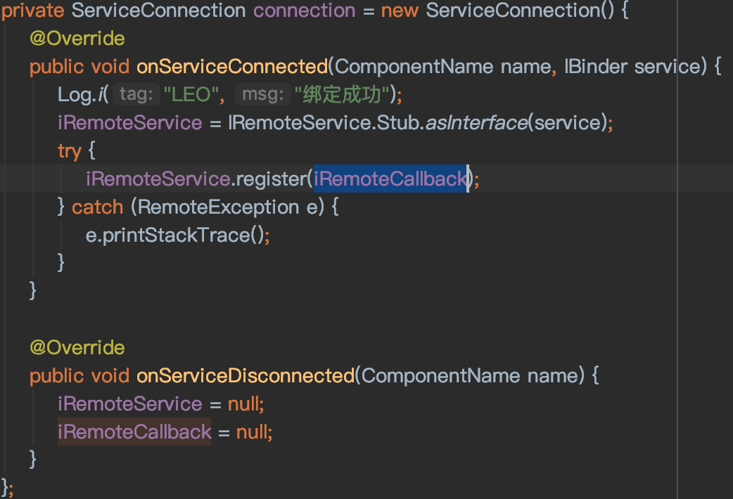 客户端的修改主要是在bindService中传递的ServiceConnection对象的实现,在回调的onServiceConnected方法中,调用register方法将回调IRemoteCallback对象注册到服务端。如下: