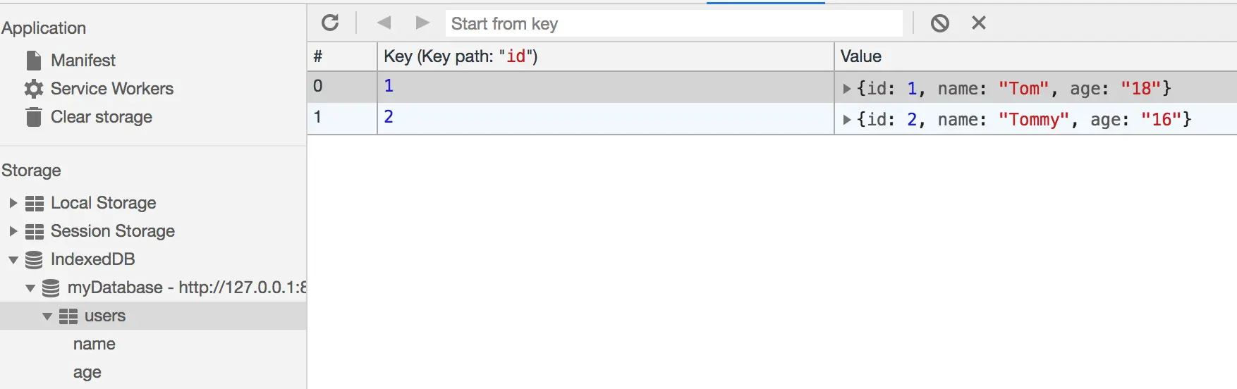 上面的例子介绍了IndexedDB的简单用法,当执行完上面的代码后可以在浏览器中看到自己新建的IndexedDB:
