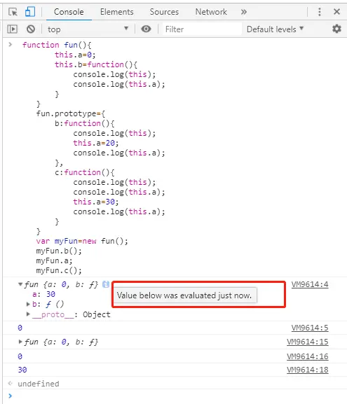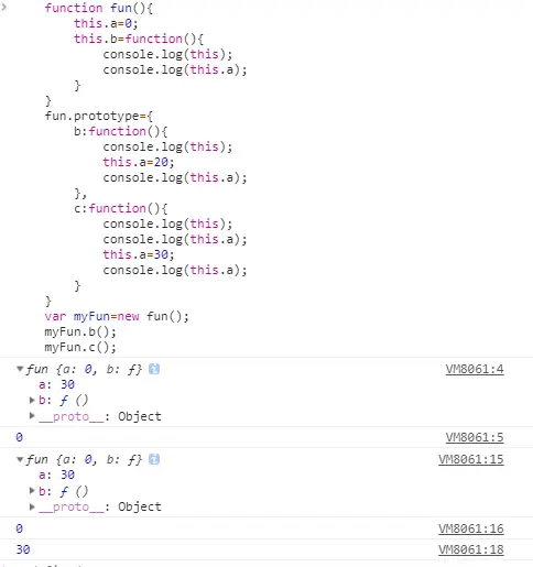- 当执行实例对象的c()的时候,实例对象同样先查找自身是否有c()函数,显然没有,此时实例对象通过原型链向上一层查找即:构造函数的原型对象,在原型对象中包含方法:c();此时,原型对象中方法c()的this对象指向实例对象即fun(){a:0,b:f}, (函数中的this对象,谁调用该函数指向谁) 在c()函数中,对实例对象的a:0重新赋值为a:30; 所以执行myFun.c();输出结果为30;
