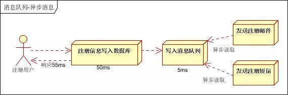 按照以上约定,用户的响应时间相当于是注册信息写入数据库的时间,也就是50毫秒。注册邮件,发送短信写入消息队列后,直接返回,因此写入消息队列的速度很快,基本可以忽略,因此用户的响应时间可能是50毫秒。因此架构改变后,系统的吞吐量提高到每秒20 QPS。比串行提高了3倍,比并行提高了两倍。