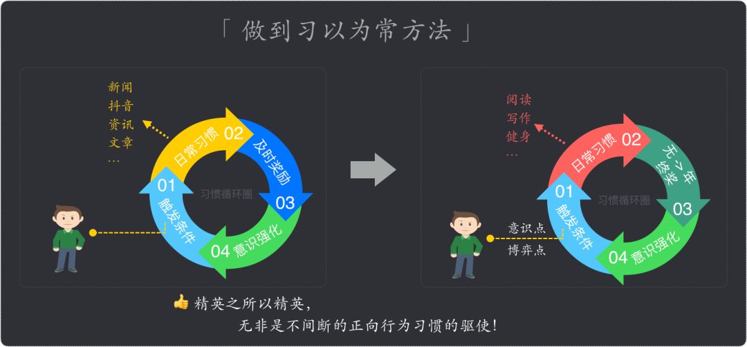 了解习惯产生的机制后,改变习惯就变得很简单,每次在触发条件发生时,弹出一道选择题,选择做无效事情,还是学习?多次以这种方式不断强化自己做对选择题。久而久之,正确的行为被训练得多了,就成为顺其自然的习惯了。所以改变习惯,就是在触发条件发生时,让自己做对选择题,打破旧有习惯回路,建立新的习惯回路。相信这句话“精英之所以精英,是不间断的正向行为习惯的驱使”。