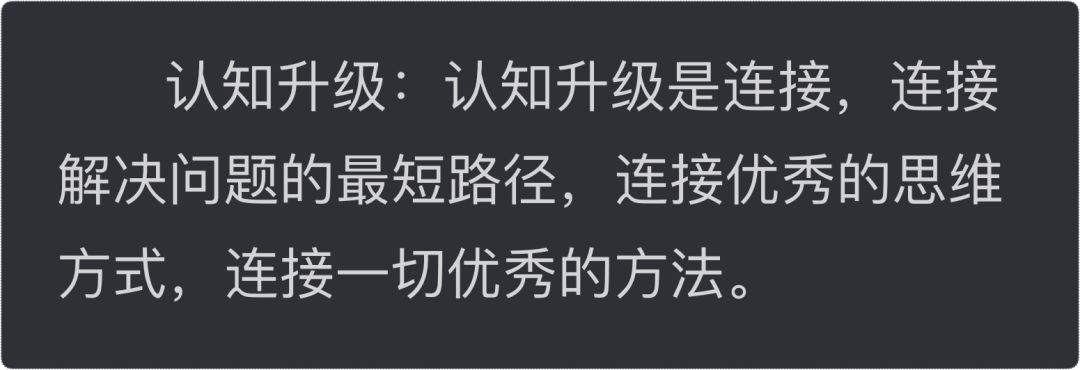 我对认知升级的定义:认知升级是连接,连接优秀的思维方式,连接解决问题的最短路径,连接一切优秀的方法。比如:说到时间管理立马连接到“找到不被打扰的时间用于投资自己”、说到执行力立马连接到“先想明白,然后一步步做下去”、说到改变习惯立马连接到“在触发条件发生进入下一个行为时,做对选择题”。通过认知的改变,会激发自己做出思考,做出行为的改变,从而影响我们的判断,提升我们的能力,确切地说认知升级颠覆了自己的思考习惯,让我们超越本能思考,摆脱了旧有的直觉和经验,建立起了新的直觉和经验。