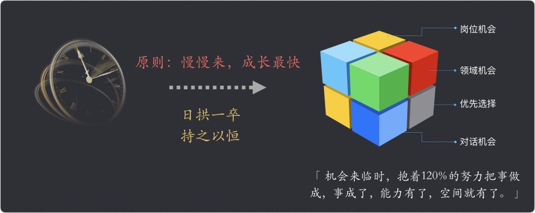 而自己一旦体会到成长,我们会把前一段时间的成长过程进行总结,抽象总结出自己的成长最佳实践,再次践行,把自己逼向下一个成长临界点,然后再次跨过去,以此反复循环,慢慢提升自己的多元能力,跨界能力。所有这些能力的提升,在未来某个机会来临的时候,因为具备足够的能力去驾驭他,此时我们要做的是,抱着120%的努力把事做成功,事情成功了,能力也有了,空间自然会有,也就被认可了。
