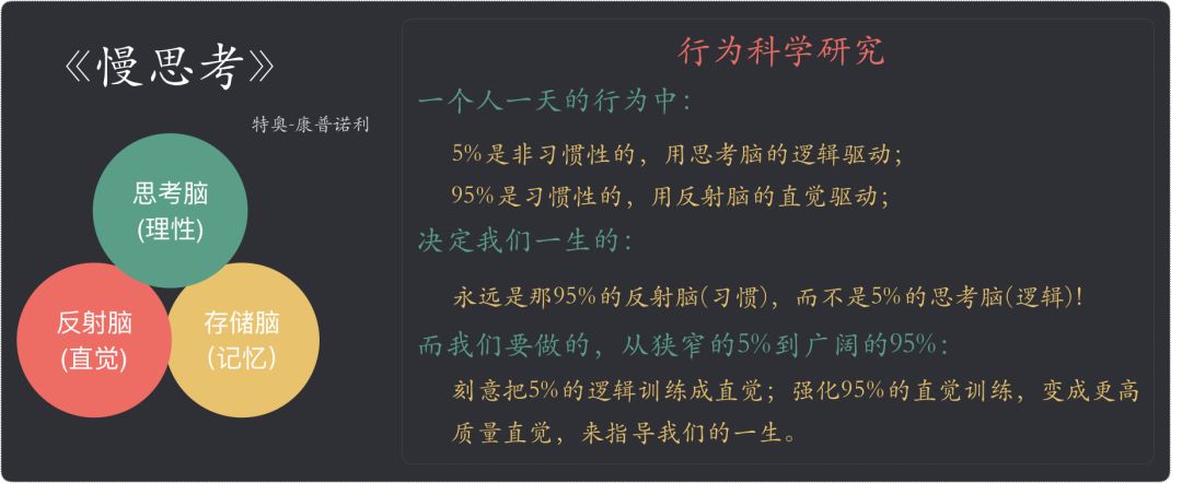 有科学家通过研究,发现一个人一天的行为中,5%是非习惯性的,用思考脑的逻辑驱动,95%是习惯性的,用反射脑的直觉驱动,决定我们一生的,永远是95%的反射脑(习惯),而不是5%的思考脑(逻辑)。回想自己的一天,大部分的判断和观点是不是都是靠直觉,靠习惯的,什么情况下才会用思考脑?是不是一个人的时候用思考脑比较多,而在多人对话场景中要快只能靠直觉和反射,而给别人好与不好的印象往往是在对话场景中建立起来的,可想而知,反射出来的观点或行为对我们而言是多么重要。