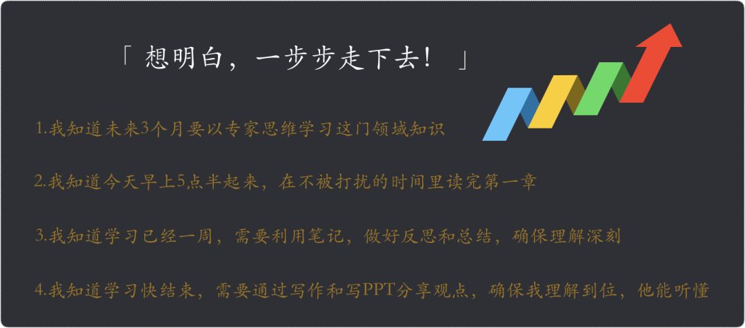 很多时候我们知道,或被提醒过,或被要求过,需要提升执行力和自律,却不知道执行力的行为指导方法,现在有了执行力背后的行为指导方法:“想明白,然后一步一步做下去”,此时的我们需要有思辨思维,通过实践“想明白,然后一步一步做下去”,内化成自己的认知和方法,指导自己的一生。
