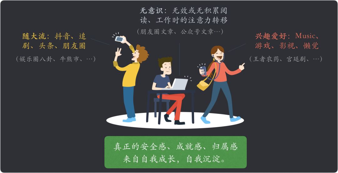 我们以为做大家正在做的事,就找到了归属感,找到了安全感,但实际上真正的安全感、成就感,归属感来自自我成长,自我沉淀。对生活在信息量爆炸时代里的我们,用好自己的注意力非常难,处处都是陷阱,处处都是诱惑,处处降低我们的思考,让我们轻易获得成品,带来的结果是表面上我们懂的很多,但其实理解非常浅。
