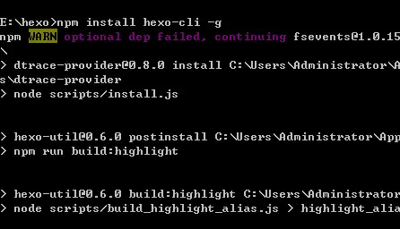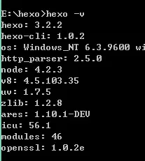 然后你会看到命令行窗口刷了一大堆白字,下面我们来看一看Hexo是不是已经安装好了。 在命令行中输入: