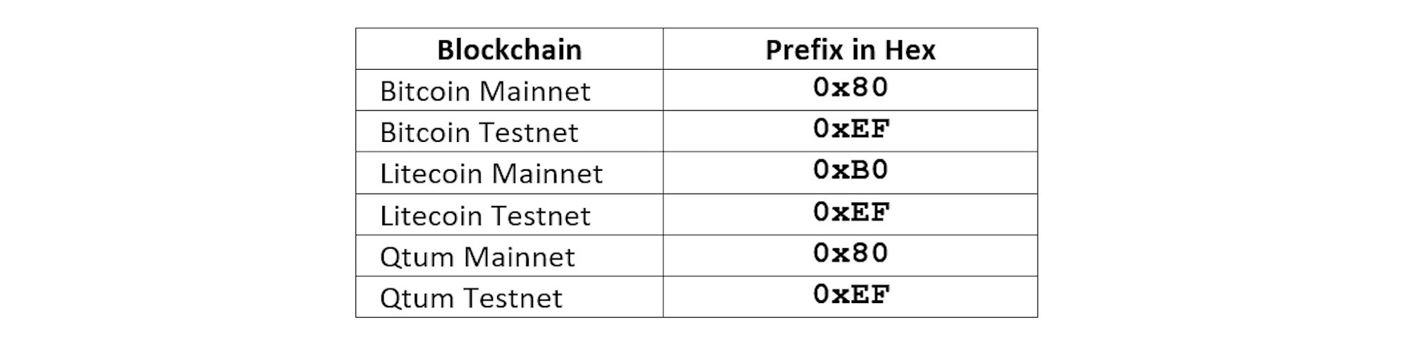 WIF的第一个字节(两个字符)将区块链定义如下: