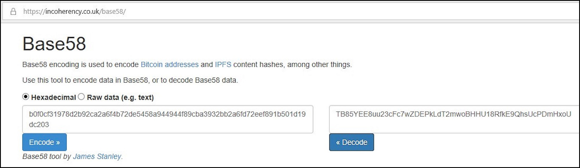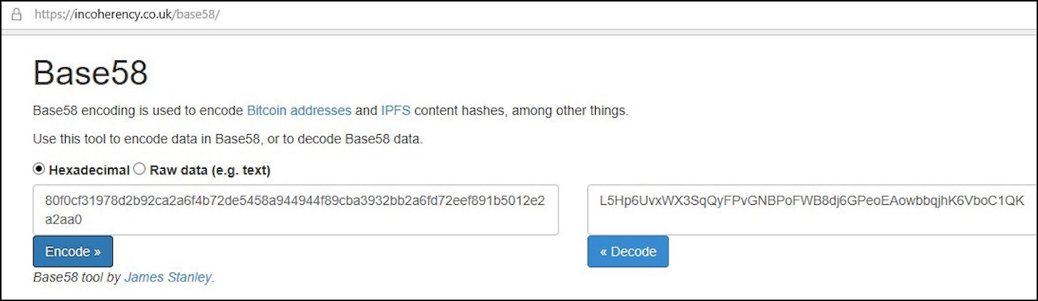 8、在 https://incoherency.co.uk/base58/中进行base58 编码将步骤7的结果复制粘贴到左侧并按下编码按钮
