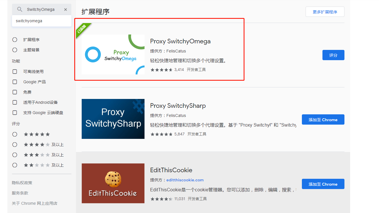 这是我们还需要个chrome的工具来辅助我们开发,我们可以在谷歌商店中下载SwitchyOmega应用(作为一个程序员翻墙啥的应该是必备技能了吧)