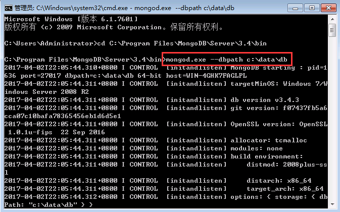 运行MongoDB服务器,就是进入你的安装bin目录输入mongod.exe了