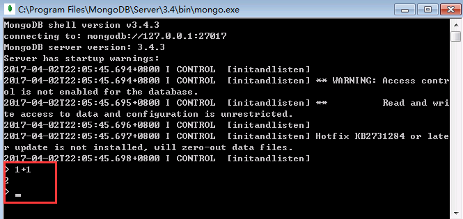 这里是通过命令行的方式启动的 MongoDB ,打开mongodb安装目录下的bin目录,然后执行mongo.exe文件,MongoDB Shell是MongoDB自带的交互式Javascript shell,用来对MongoDB进行操作和管理的交互式环境。 由于它是一个JavaScript shell,您可以运行一些简单的算术运算: