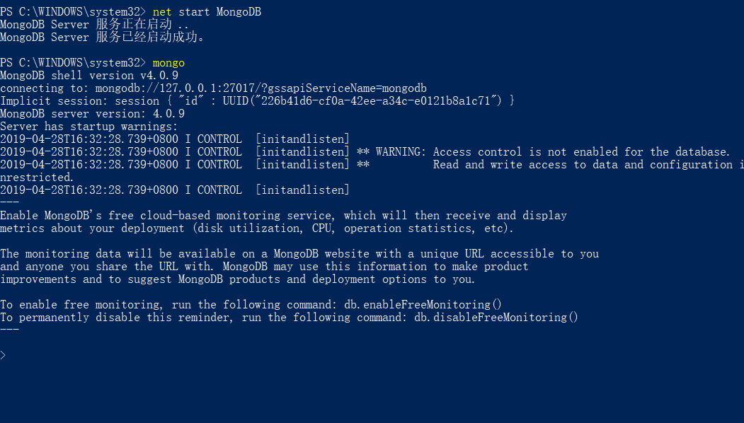 到这里通过windows服务配置mongoDB服务已经基本完成了,接下来你使用mongodb只需要打开cmd输入mongo就行了