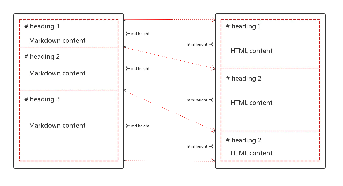 而标题对齐要更加精确一些,它把编辑区和预览区的高度换成了标题高度+标题下内容的高度即片段的高度,然后根据当前的片段对应的高度计算滚动距离。