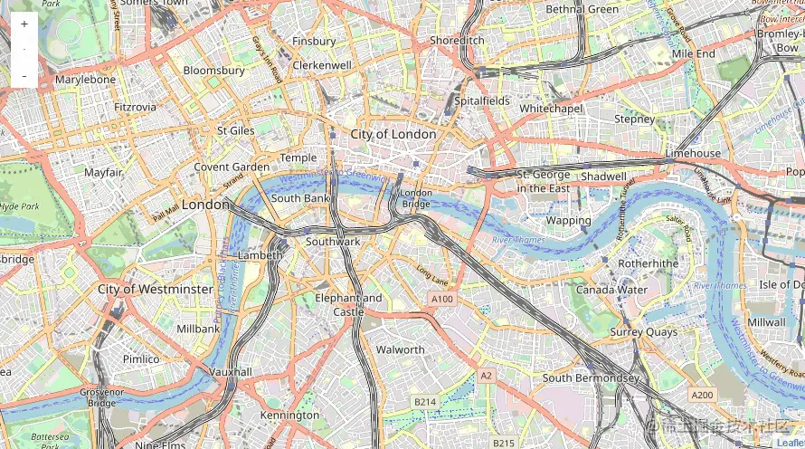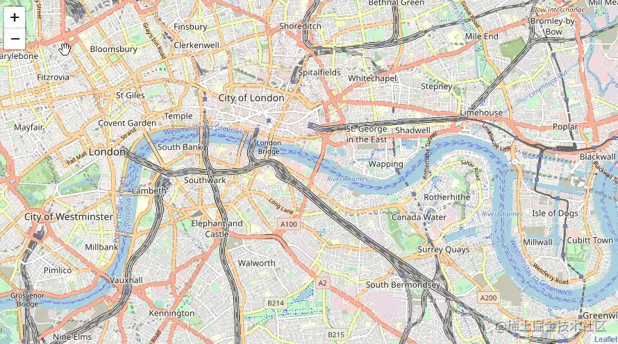 放大,缩小也一样,地图通常会默认开启此项功能。而大多数情况下,WebGIS 库会提供一些如图所示的控件来实现一级一级地放大的功能。因此, 放大与缩小实现的办法有两种。