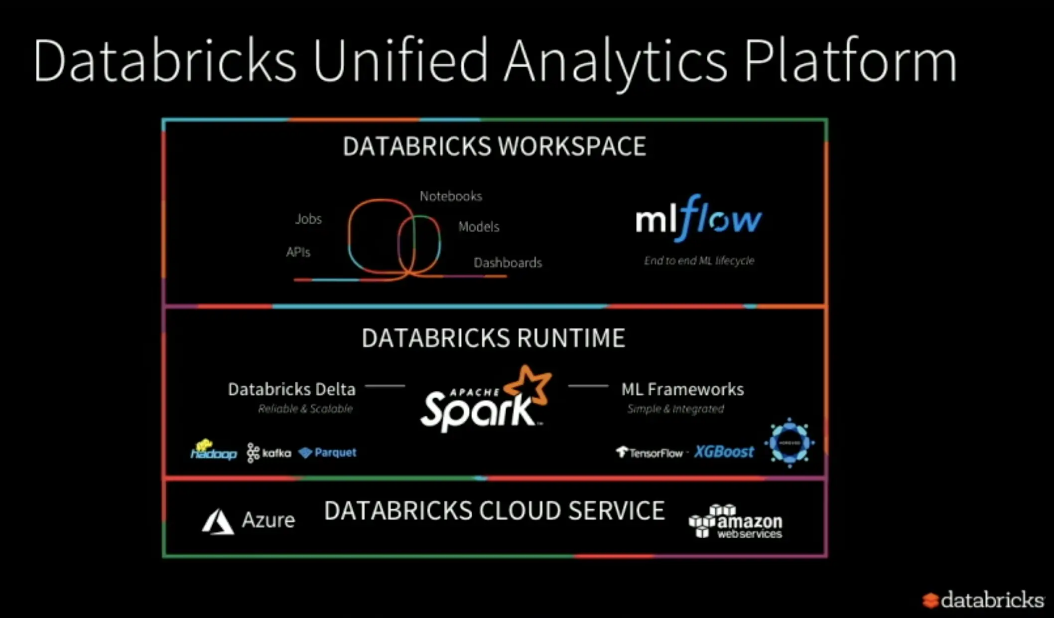 最近的 Spark+AI 峰会上, Databricks 主打的主题是统一分析平台(Unified Analytics Platform)。三大新发布:Databricks delta、Databricks Runtime for ML和 ML flow,都是围绕这一主题。随着近年来机器学习(包括深度学习)在数据处理中占比越来越高,可以说 Databricks 又一次把握住了时代的脉搏。