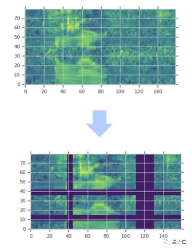 可以看出,通过在时间方向上进行扭曲,外加屏蔽多个连续时间步长(垂直方向屏蔽)和梅尔频率频道(水平方向屏蔽),能有效扩增数据频谱图。