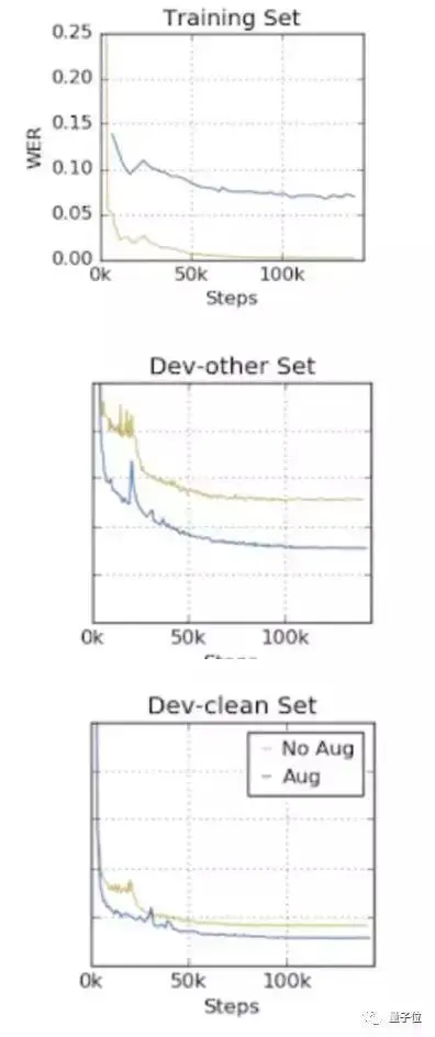研究人员限用大型开源语音识别数据集LibriSpeech上进行实验,比对模型生成的文字与目标文字的差异。他们选取了端对端谷歌语音识别神经网络框架Listen, Attend and Spell(LAS),比较了使用SpecAugment扩增数据与不使用情况下训练出网络的性能。