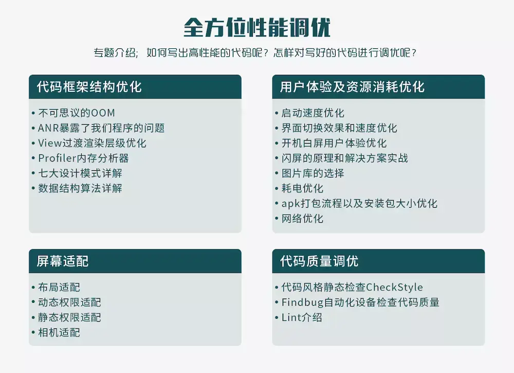 (包括自定义控件、NDK、架构设计、混合式开发工程师(React native,Weex)、性能优化、完整商业项目开发等)