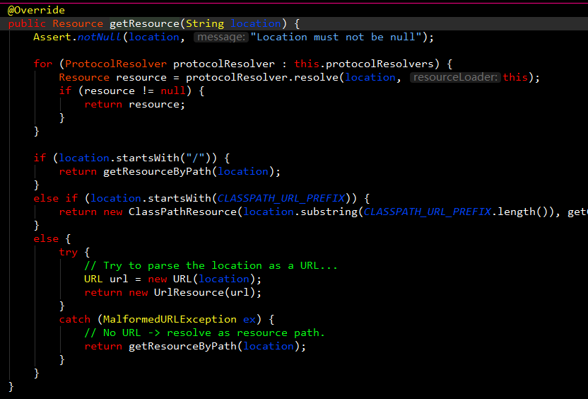 在FileResourceLoader中可以找到同样的方法,而该方法来自于FileResourceLoader重写其父类DefaultResourceLoader,该方法在ResourceLoader接口中定义,在FileResourceLoader和DefaultResourceLoader中都提供了各自的实现。而其调用在DefaultResourceLoader的getResource方法中: