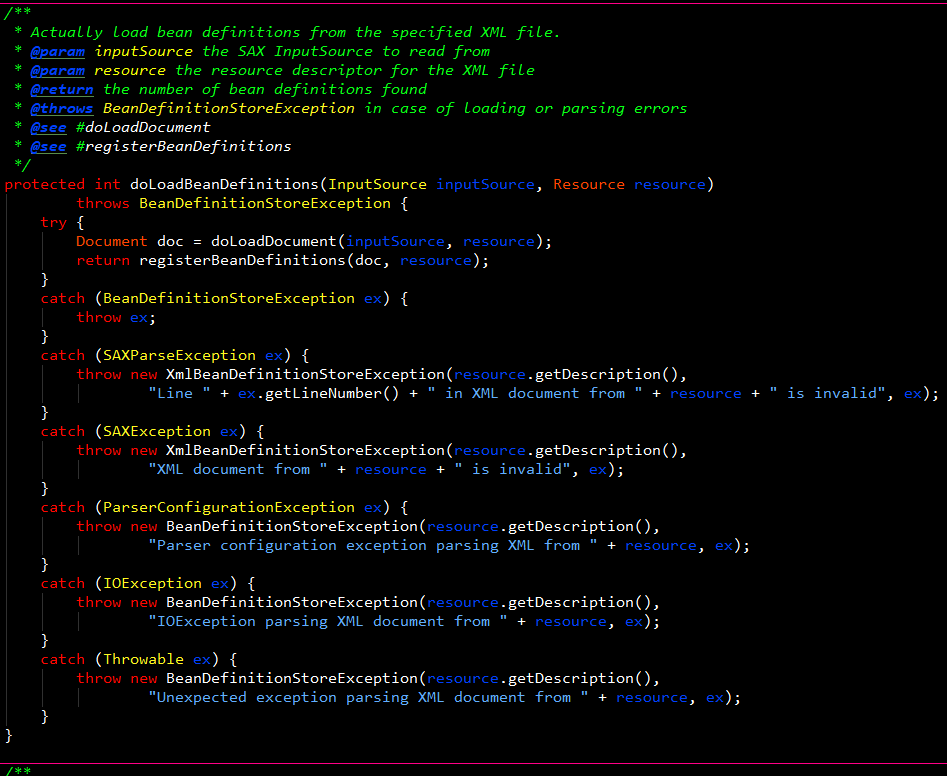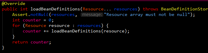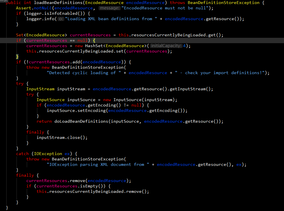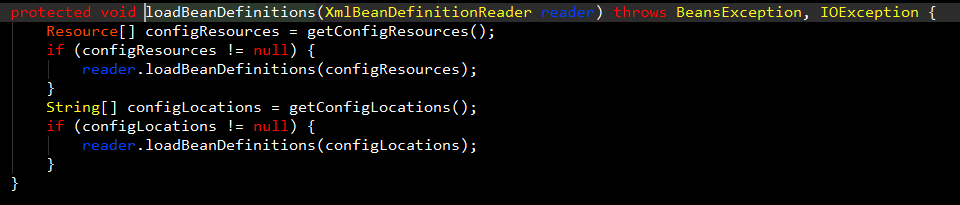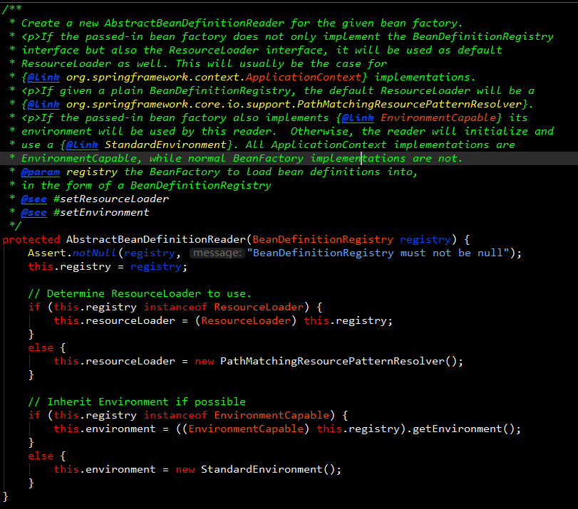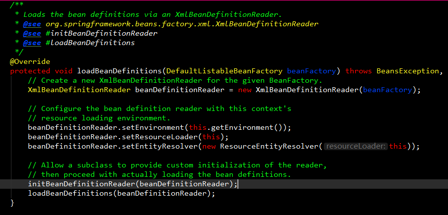如果传入的BeanFactory只实现了BeanDefinitionRegistry,那就注入,如果还实现了ResourceLoader,就把它作为默认的ResourceLoader,如果实现了EnvironmentCapable,会把其内部的环境也加载进来。 然后我们回过来继续看其子类XMLBeanDefinitionReader,其重载了loadBeanDefinitions方法,不使用父类的实现