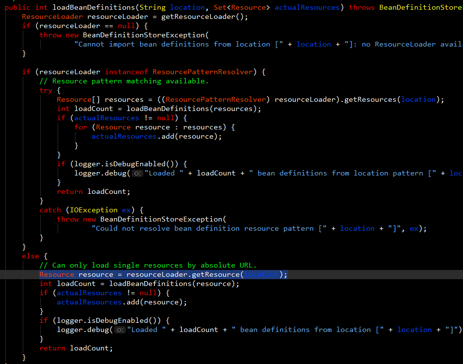 这里可以看出在BeanDefinitionReader中注入了一个ResourceLoader,此处可以看到对ResourceLoader调用了getResource方法,这样就可以完成对该方法的整个追溯过程了