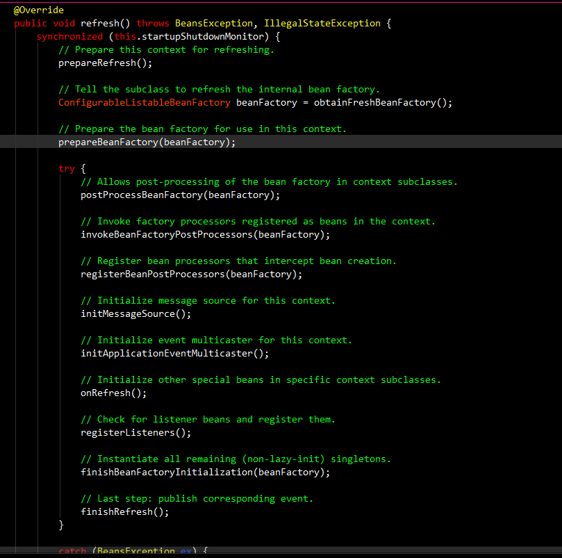 对容器的启动来说,refresh是一个很重要的方法。该方法在AbstractApplicationContext类中找到,它详细的描述了整个ApplicationContext的初始化过程。