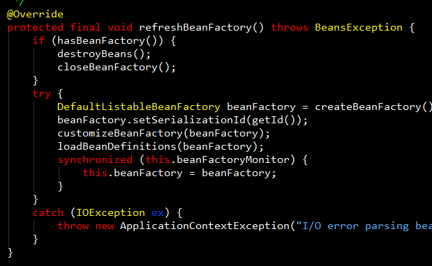 我们去看FileSystemXmlApplicationContext的基类AbstractRefreshableApplicationContext是怎样实现的。 首先看他的refreshBeanFactory方法: