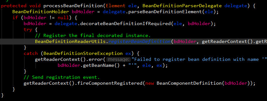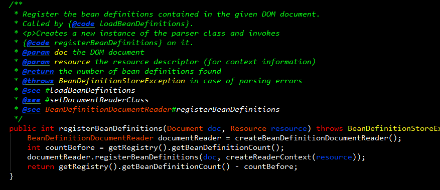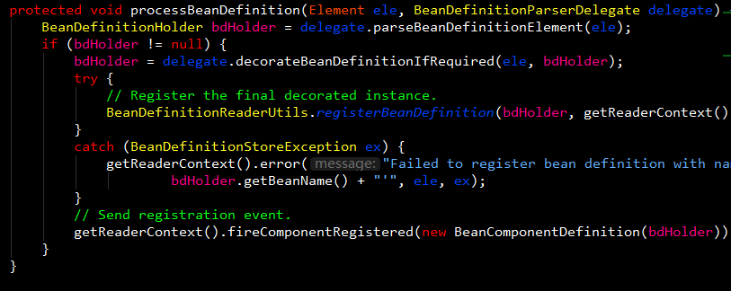 在注册的方法中,是通过调用BeanDefinitionDocumentReader进行的,实际调用的是其实现类DefaultBeanDefinitionDocumentReader,在其方法中又是通过其持有的BeanDefinitionParserDelegate进行的。
