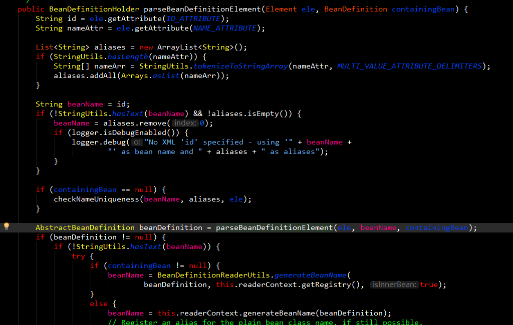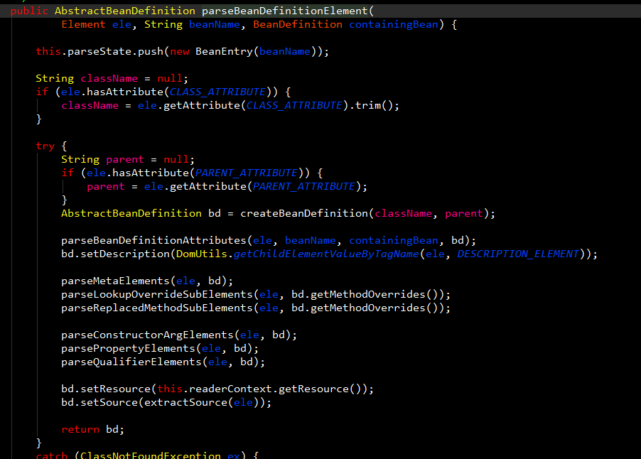 解析过程: 调用delegate的parseBeanDefinitionElement方法: