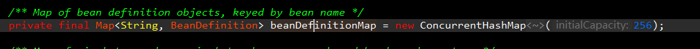 在BeanDefinition的载入和解析完成后,用户定义的BeanDefinition信息已经在IOC容器内建立了自己的数据结构以及相应的数据表示,但此时这些数据还不能供IOC容器直接使用,需要在IOC中对这些BeanDefinition数据进行注册。在DefaultListableBeanFactory中,是通过一个HashMap来持有载入的BeanDefinition的,这个HashMap的定义在DefaultListableBeanFactory中可以看到。